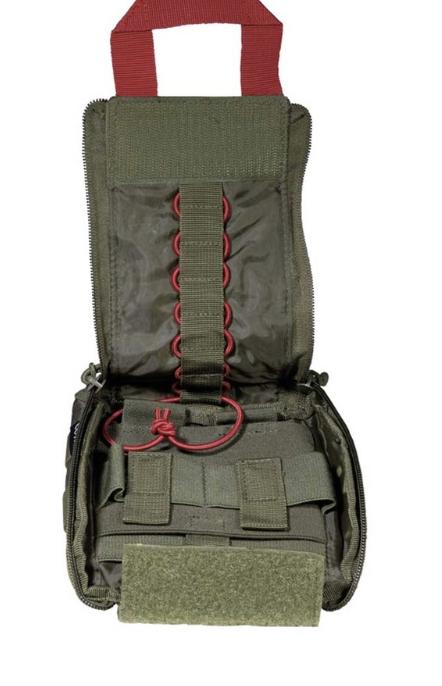 - El interior está meticulosamente organizado con sujeciones elásticas, perfectas para mantener gasas, vendajes, tiritas y otros elementos de primeros auxilios en orden y al alcance de la mano.